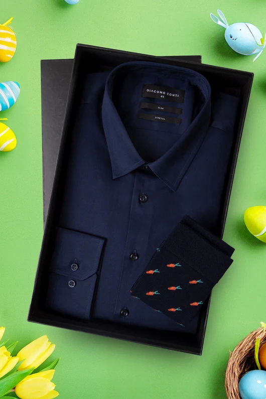 Elegancki wygląd – granatowa koszula w klasycznym stylu dodaje szyku każdej stylizacji.