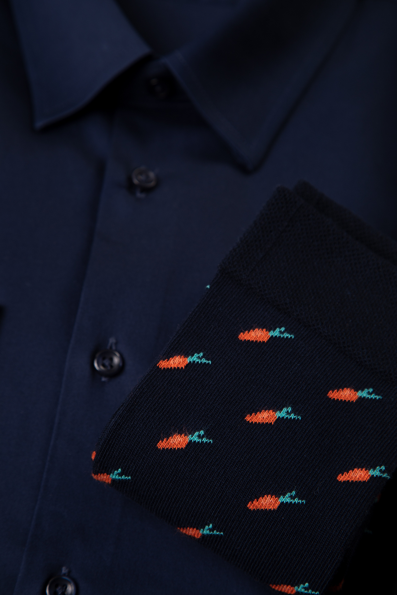 Zabawny akcent – skarpetki z motywem marchewek dodają lekkości i charakteru.