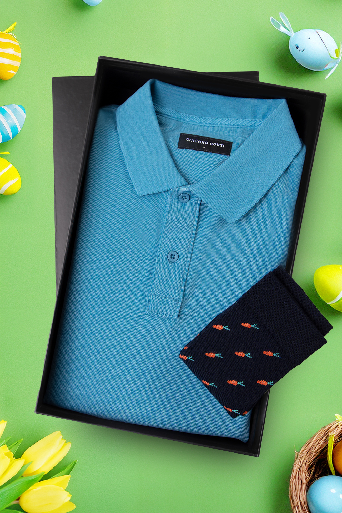 Elegancki i wiosenny zestaw prezentowy, idealny na wielkanocny prezent dla niego. W komplecie znajduje się stylowa niebieska koszulka polo – idealna na co dzień i na bardziej casualowe okazje oraz granatowe skarpety ozdobione motywem marchewek, które dodają charakteru i przełamują klasyczny styl nutą oryginalności. Całość zapakowana jest w estetyczne pudełko prezentowe, gotowe do wręczenia bez potrzeby dodatkowego pakowania. To świetny pomysł na prezent dla mężczyzny ceniącego wygodę, styl i odrobinę luzu w garderobie.