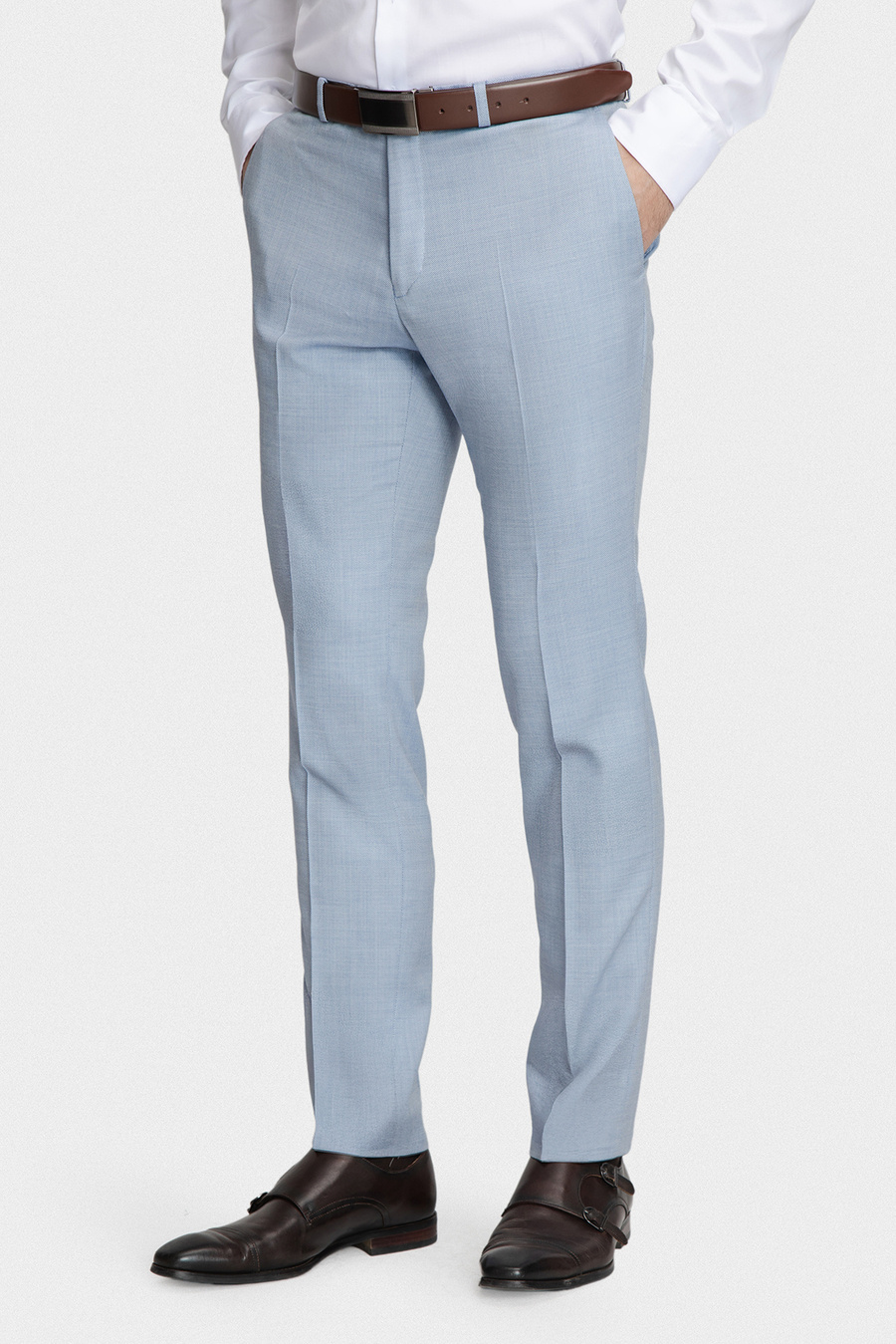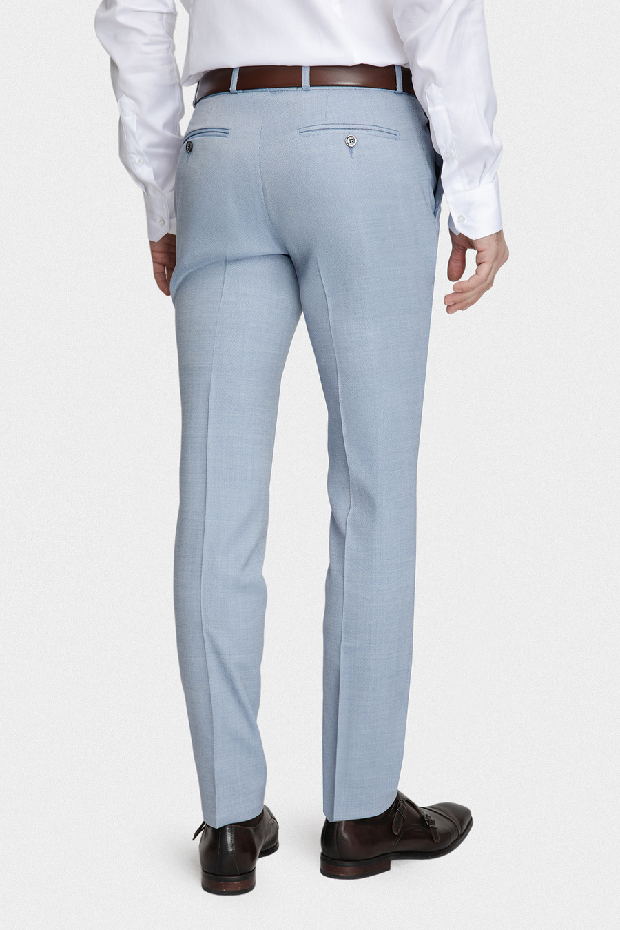Klasyczny niebieski kolor nadaje spodniom eleganckiego i uniwersalnego charakteru, umożliwiając tworzenie wielu spójnych stylizacji z koszulą, marynarką lub dzianiną. Prosta nogawka z delikatnym kantem podkreśla formalny styl, natomiast regularny stan zapewnia wygodę i swobodę ruchów przez cały dzień. To idealny wybór dla mężczyzn ceniących jakość, precyzję wykonania i ponadczasową elegancję.
