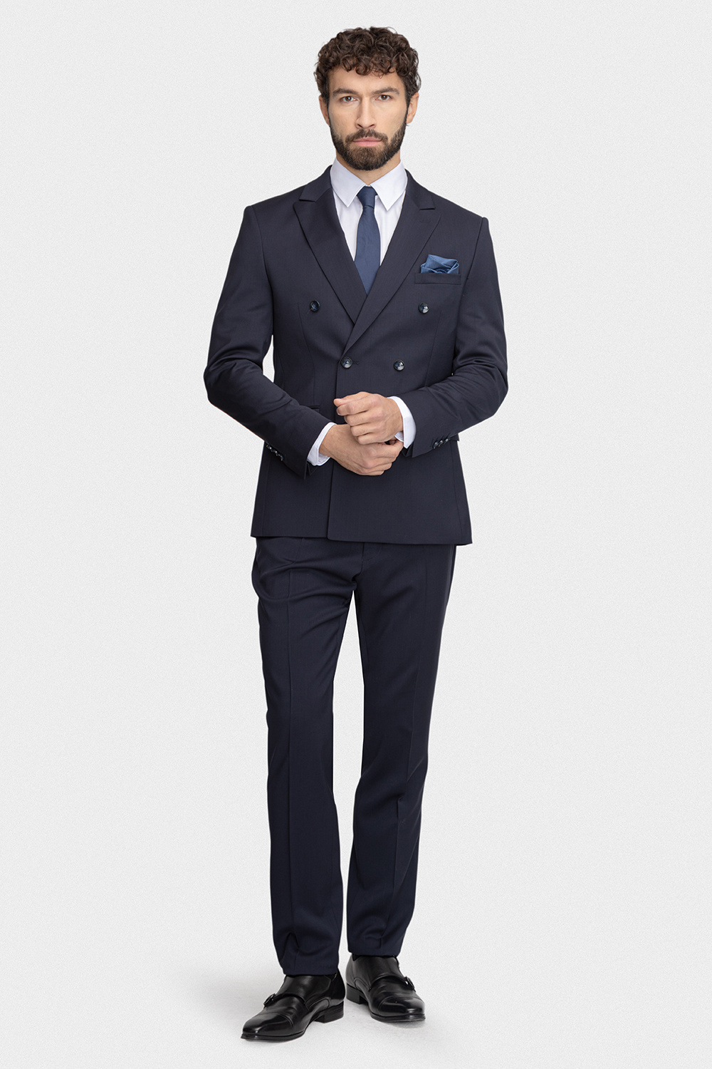 Spodnie garniturowe w klasycznym granatowym odcieniu i o gładkiej strukturze to gwarancja uniwersalności. Zapinane na zamek błyskawiczny i guzik, łączą w sobie prostotę i funkcjonalność. Delikatne zaprasowanie na kant podkreśla formalny charakter stylizacji, dodając jej elegancji. Dopasowany fason typu slim doskonale układa się na sylwetce.