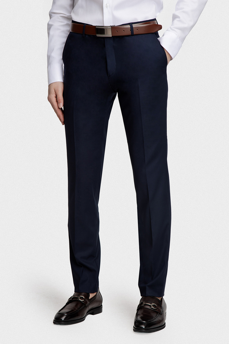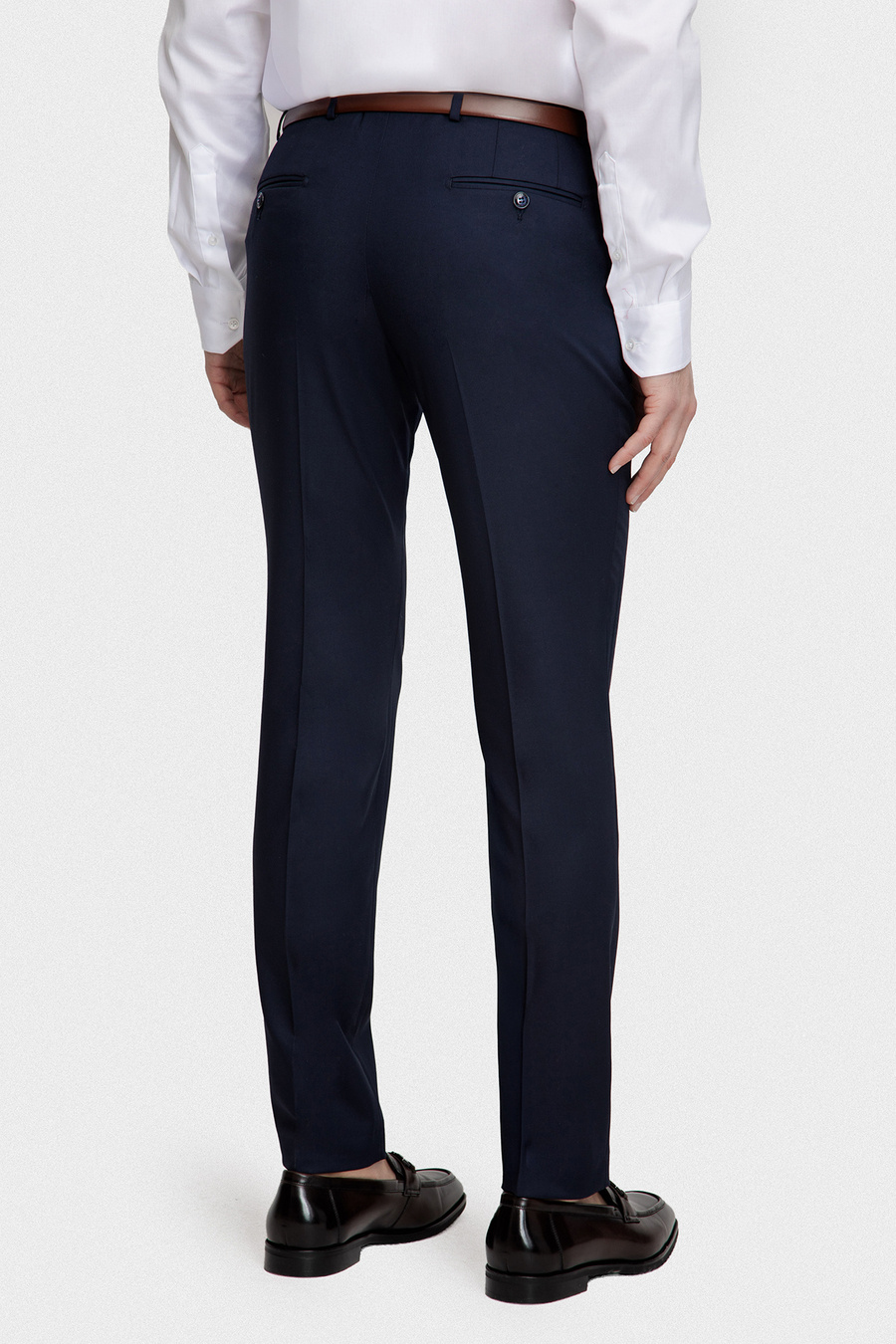 Granatowe spodnie o gładkiej strukturze stanowią klasyczną i ponadczasową bazę męskiej garderoby. Doskonale sprawdzą się zarówno w formalnych stylizacjach garniturowych, jak i w eleganckich zestawach półformalnych. Dopasowany fason slim subtelnie podkreśla sylwetkę, zachowując przy tym wysoki komfort użytkowania. Klasyczne zapięcie, staranne wykończenie oraz praktyczne kieszenie podkreślają minimalistyczny i elegancki charakter modelu.