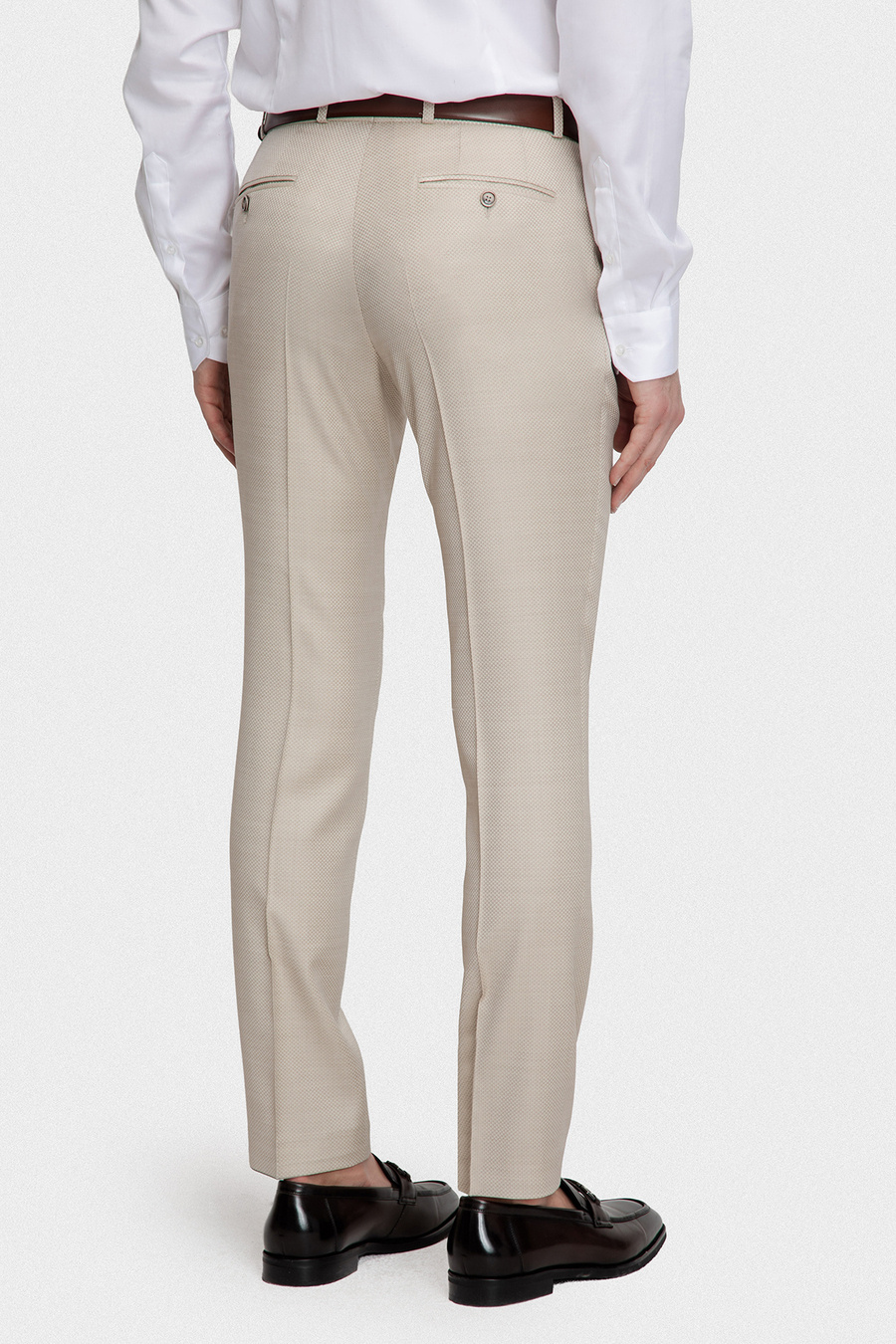Dopasowany krój slim podkreśla sylwetkę, zapewniając jednocześnie wygodę i swobodę ruchów. Tkanina będąca połączeniem wełny i jedwabiu gwarantuje lekkość, przewiewność oraz subtelny, szlachetny połysk. Delikatny wzór w strukturę nadaje całości eleganckiej głębi i wyrafinowanego charakteru.