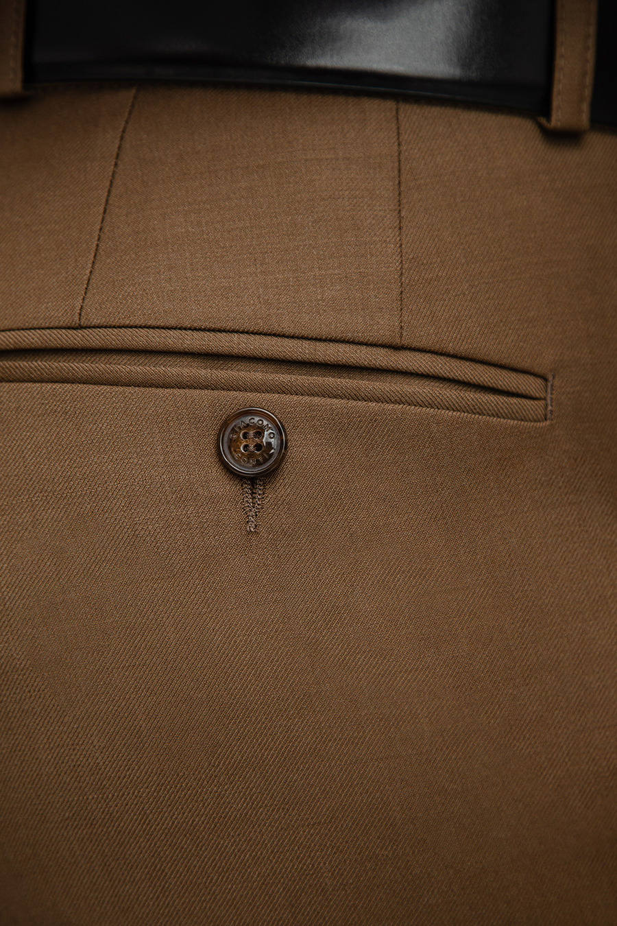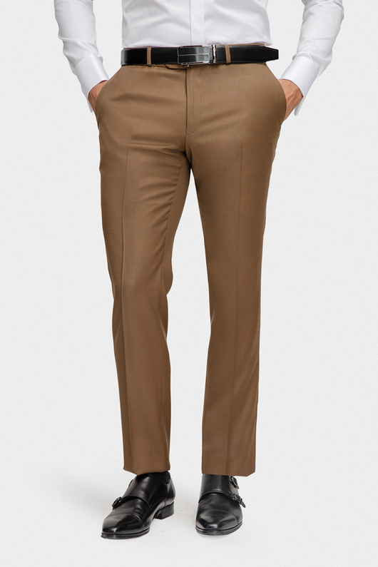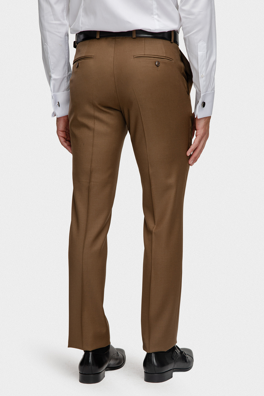 Brązowe spodnie męskie uszyte z wysokogatunkowej wełny 110’s to kwintesencja elegancji i klasy w nowoczesnym wydaniu. Tkanina o wykończeniu Finitura Felice charakteryzuje się wyjątkową miękkością, delikatnym połyskiem oraz doskonałą odpornością na zagniecenia, dzięki czemu spodnie prezentują się nienagannie przez cały dzień.