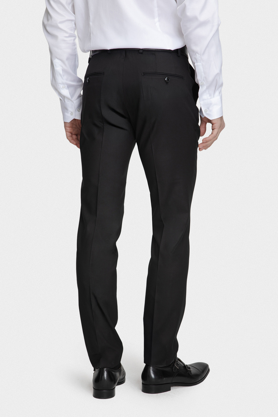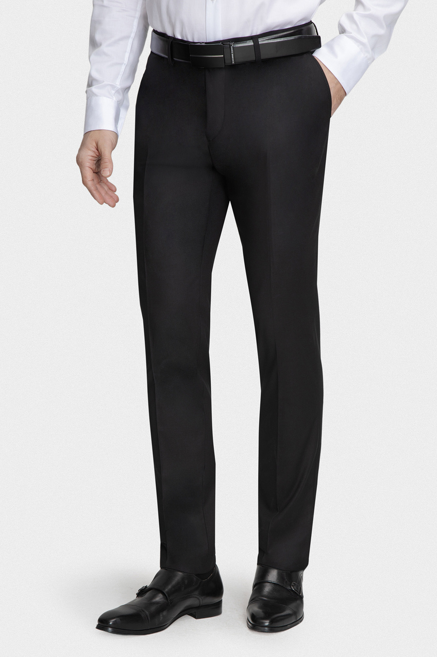 Czarne spodnie o gładkiej strukturze stanowią klasyczną i ponadczasową bazę męskiej garderoby. Doskonale sprawdzą się zarówno w formalnych stylizacjach garniturowych, jak i w eleganckich zestawach półformalnych. Dopasowany fason typu slim subtelnie podkreśla sylwetkę, zachowując przy tym wysoki komfort użytkowania. Klasyczne zapięcie, staranne wykończenie oraz praktyczne kieszenie podkreślają minimalistyczny i elegancki charakter modelu.