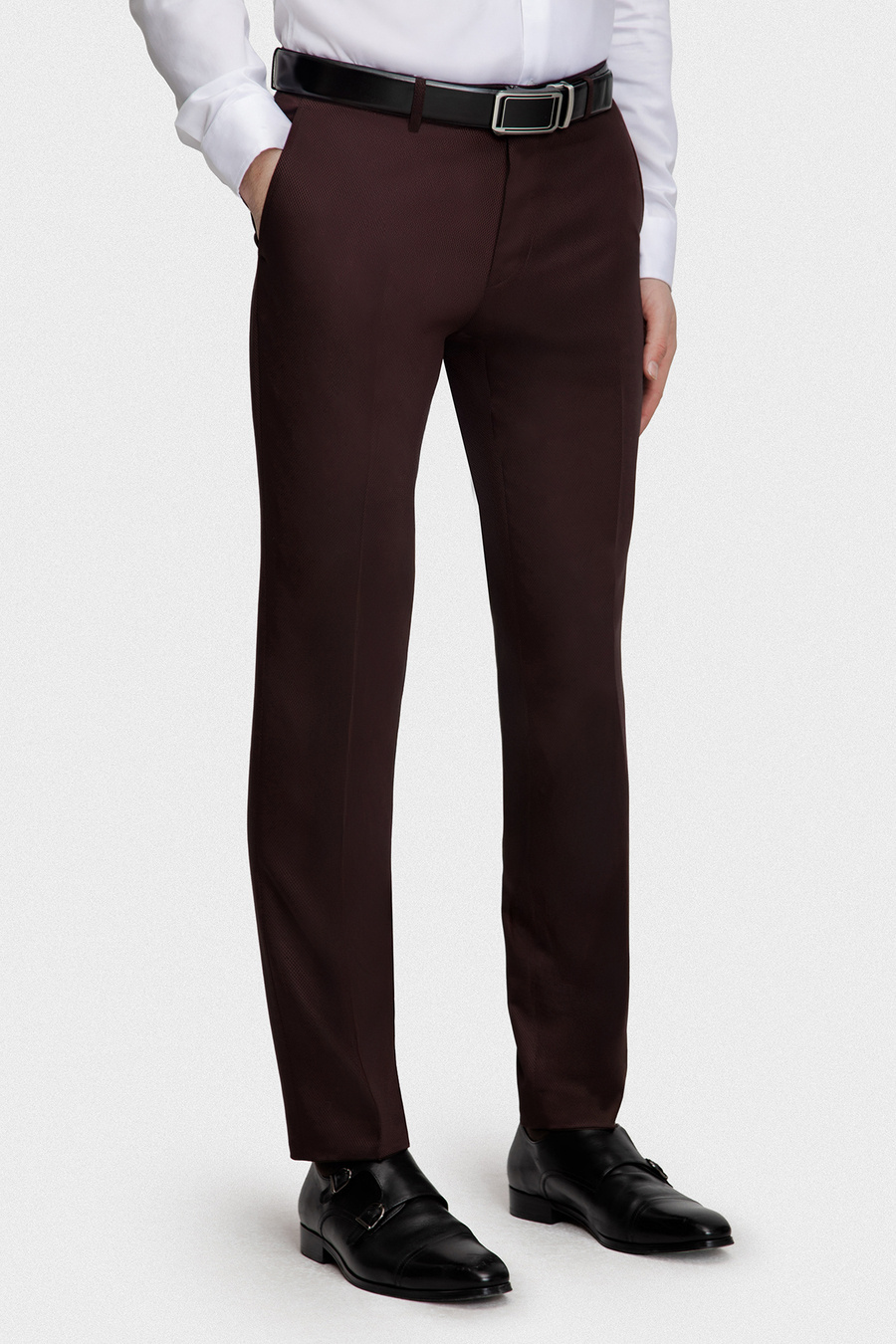 Spodnie w odcieniu czekoladowego brązu o lekkiej strukturze i dopasowanym kroju typu slim to elegancki, a zarazem nowoczesny element męskiej garderoby. Fason slim podkreśla sylwetkę, a klasyczne zaprasowanie w kant dodaje całości wyrafinowanego, formalnego charakteru.