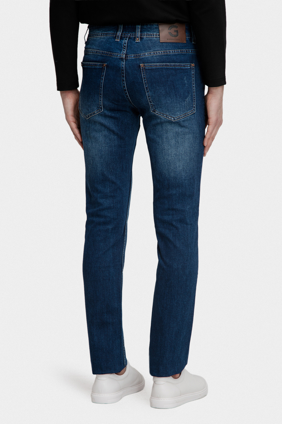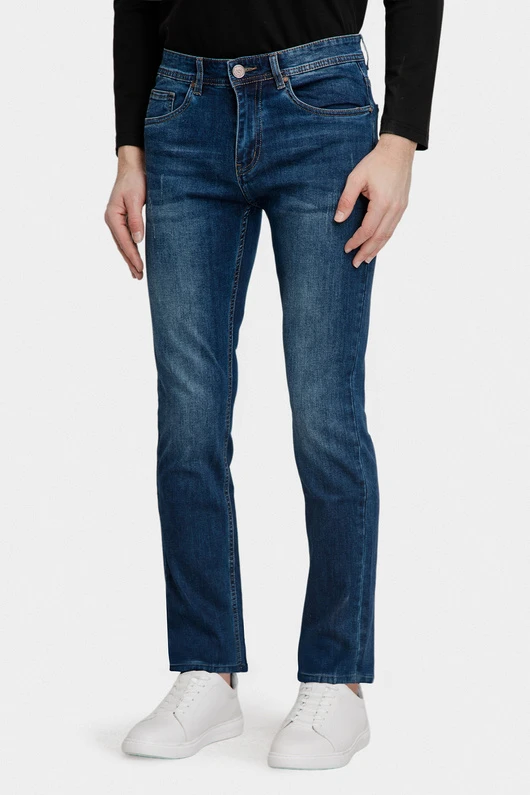 Model wykonany z wysokiej jakości materiału w uniwersalnym, średnim odcieniu niebieskiego, subtelnie cieniowanego dla efektu lekkiego sprania.
