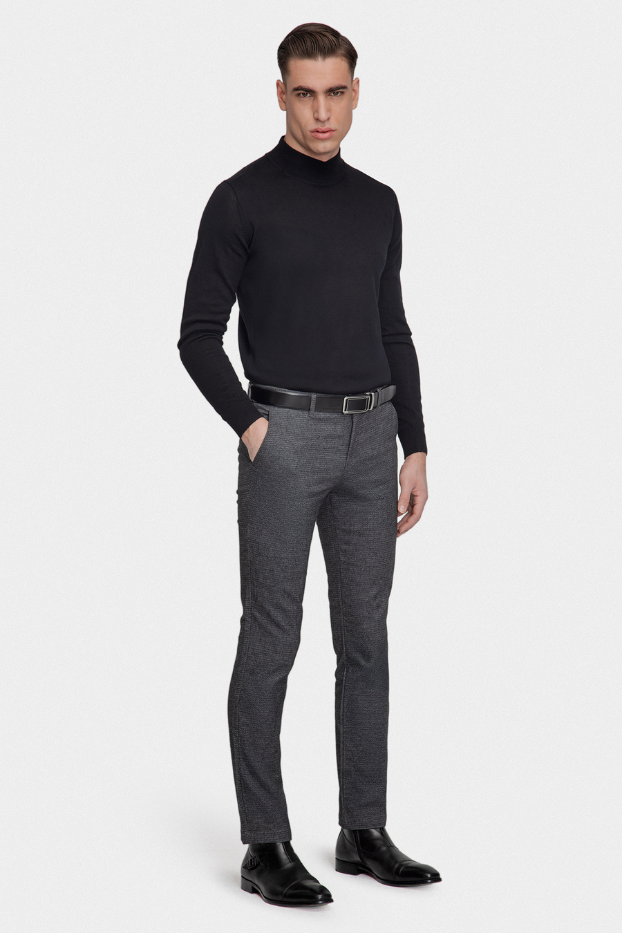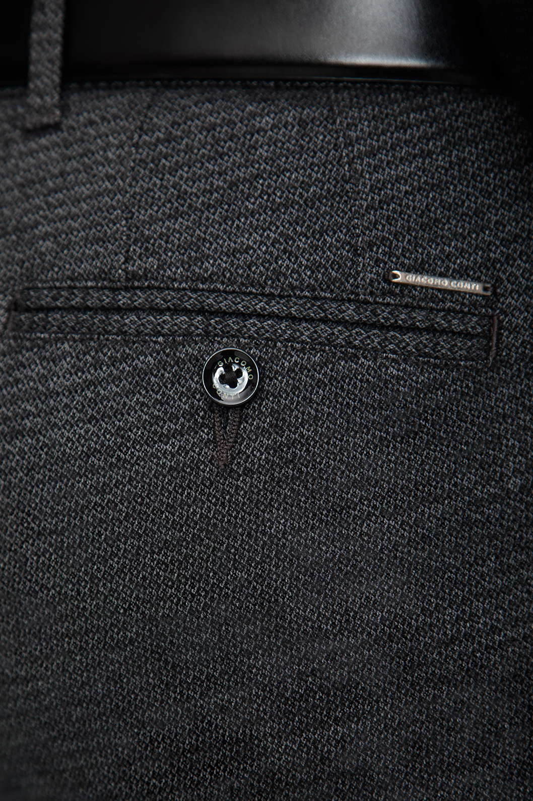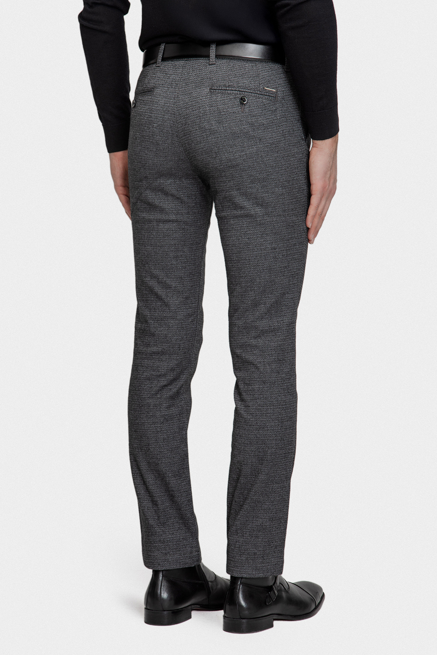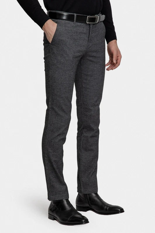 Spodnie wyróżniają się eleganckim, szarym odcieniem wzbogaconym o subtelny mikrowzór, który nadaje całości nowoczesnego i stylowego charakteru. Fason slim podkreśla sylwetkę, zachowując jednocześnie wygodę użytkowania.