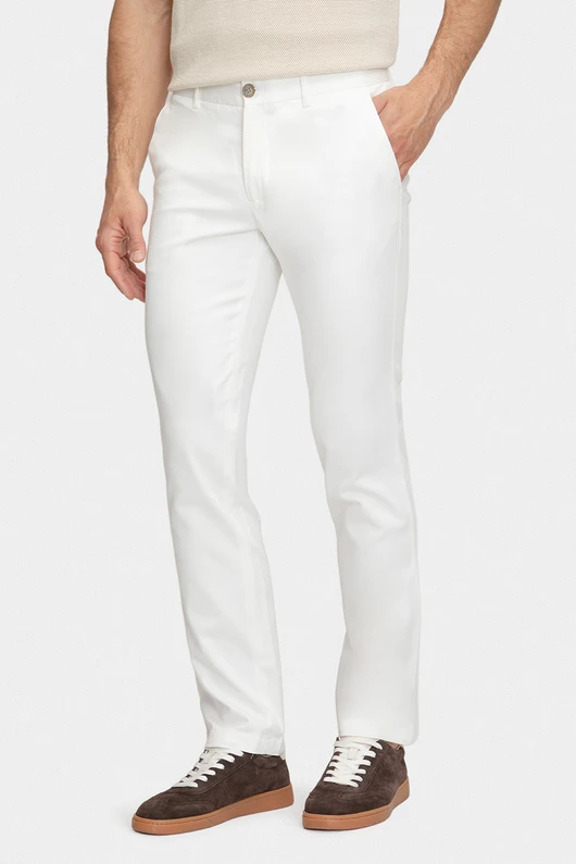 Białe męskie spodnie o kroju slim to połączenie swobodnej elegancji i codziennej wygody. Smukła linia optycznie wysmukla sylwetkę, a elastyczna tkanina pracuje przy każdym kroku. Naturalna bawełna odpowiada za przewiewność, tencel dodaje miękkości i przyjemnego chłodu, a odrobina elastanu dba o komfort dopasowania.