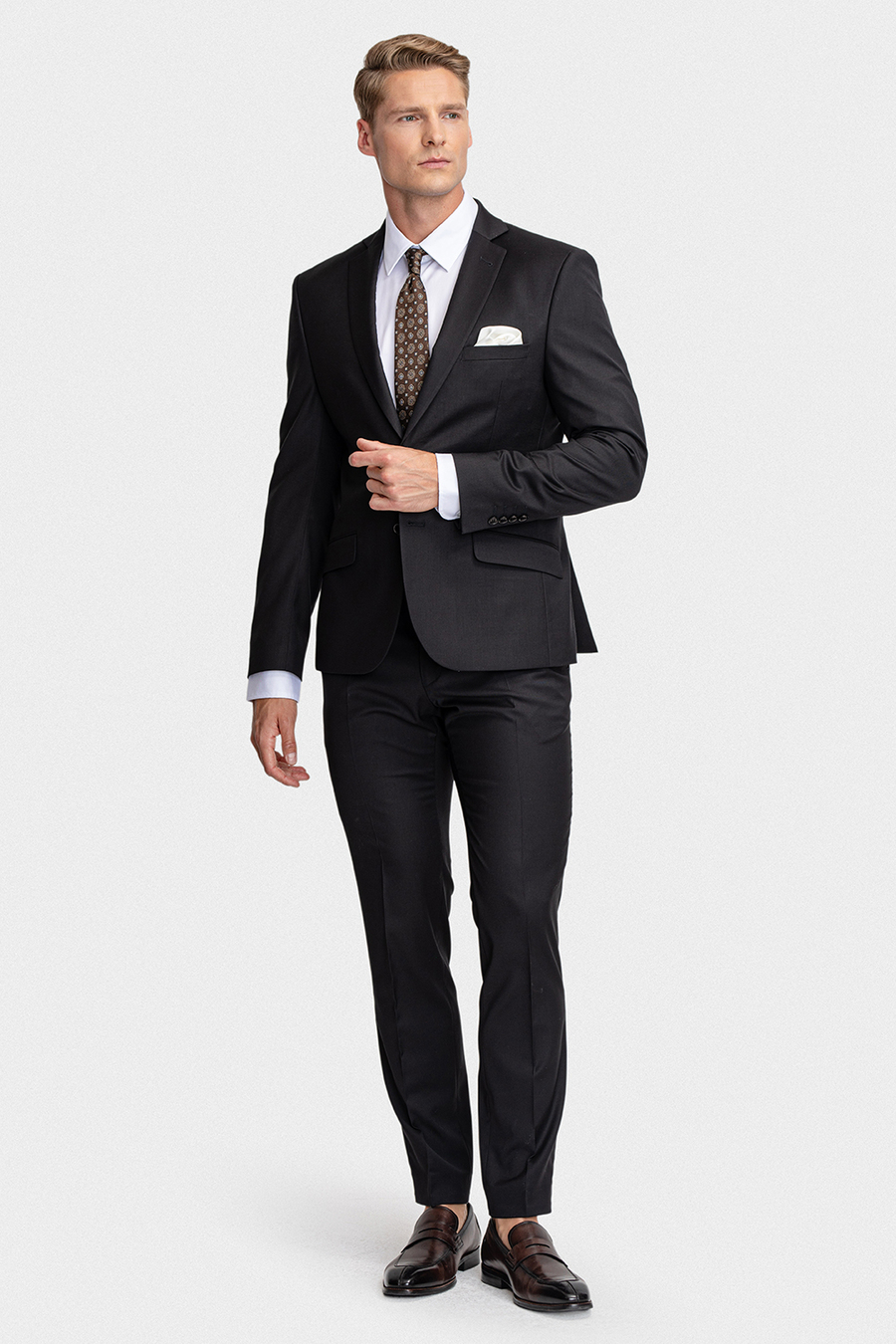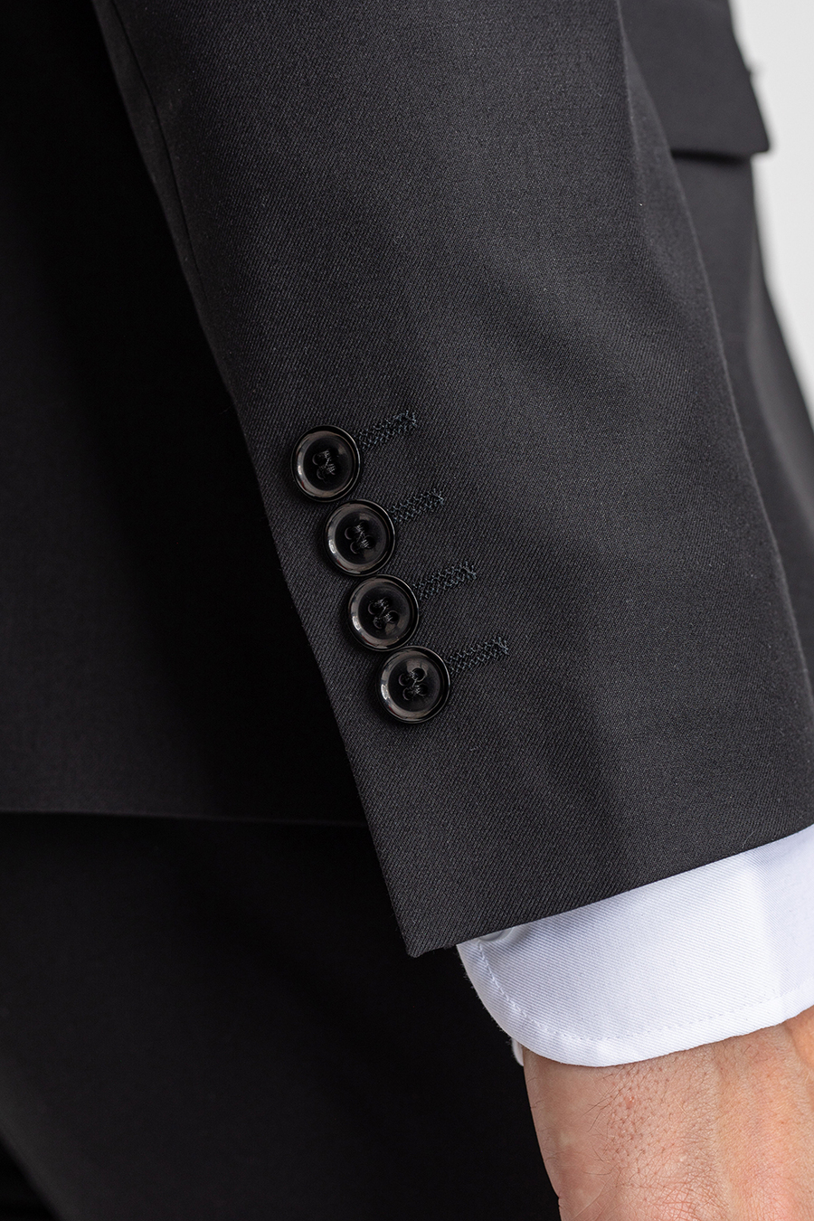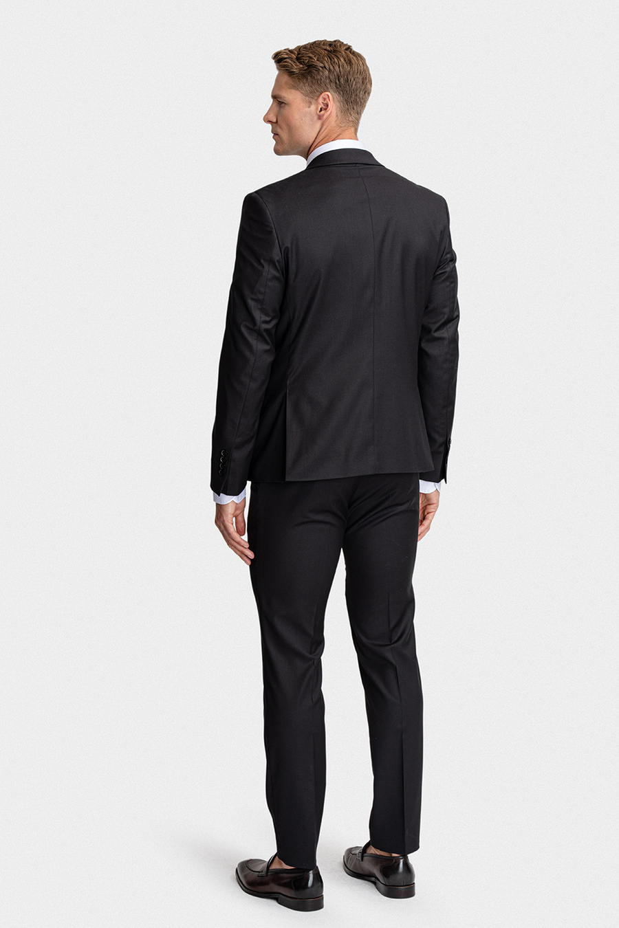 Czarny gładki garnitur męski wpasuje się w niemal każdą stylizację męską czyniąc ją oryginalną. Zastosowanie najwyższej jakości mieszanki tkanin gwarantuje niezwykle miękką, elastyczną propozycję o wysokiej głębi koloru. Tkanina o niskim zakresie pielęgnacji, trwała i odporna na zagniecenia.