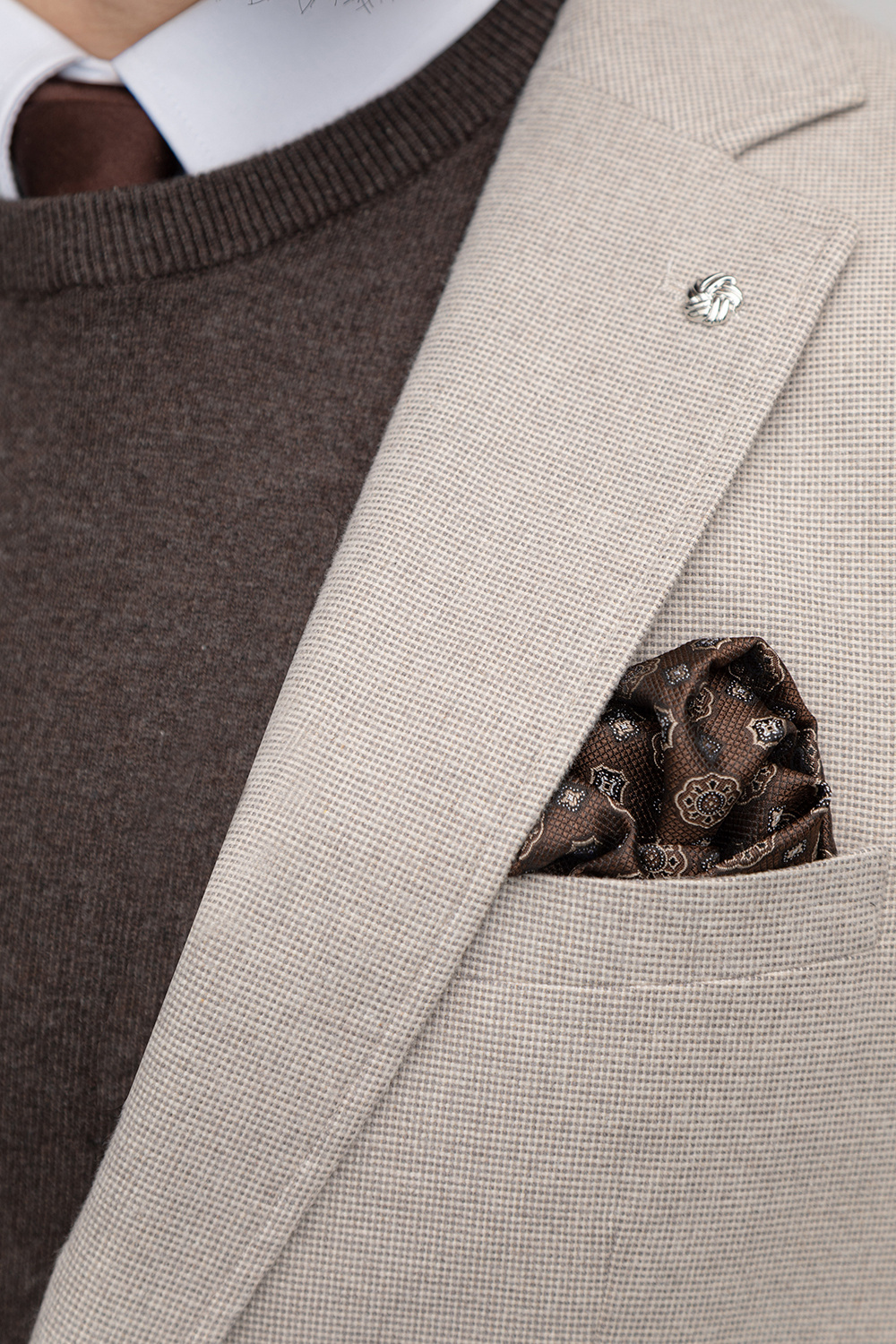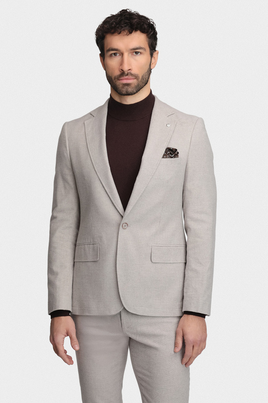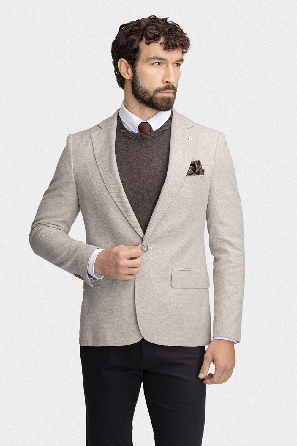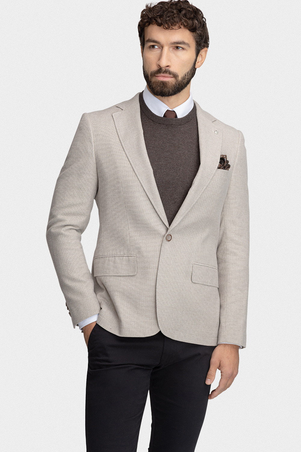 Beżowy odcień w połączeniu z subtelną strukturą dzianiny podkreśla naturalny i stylowy charakter marynarki. Fason comfort, delikatnie poszerzany w okolicach talii i brzucha, oferuje swobodę ruchów bez rezygnacji z eleganckiej linii.