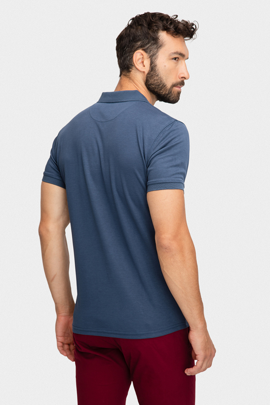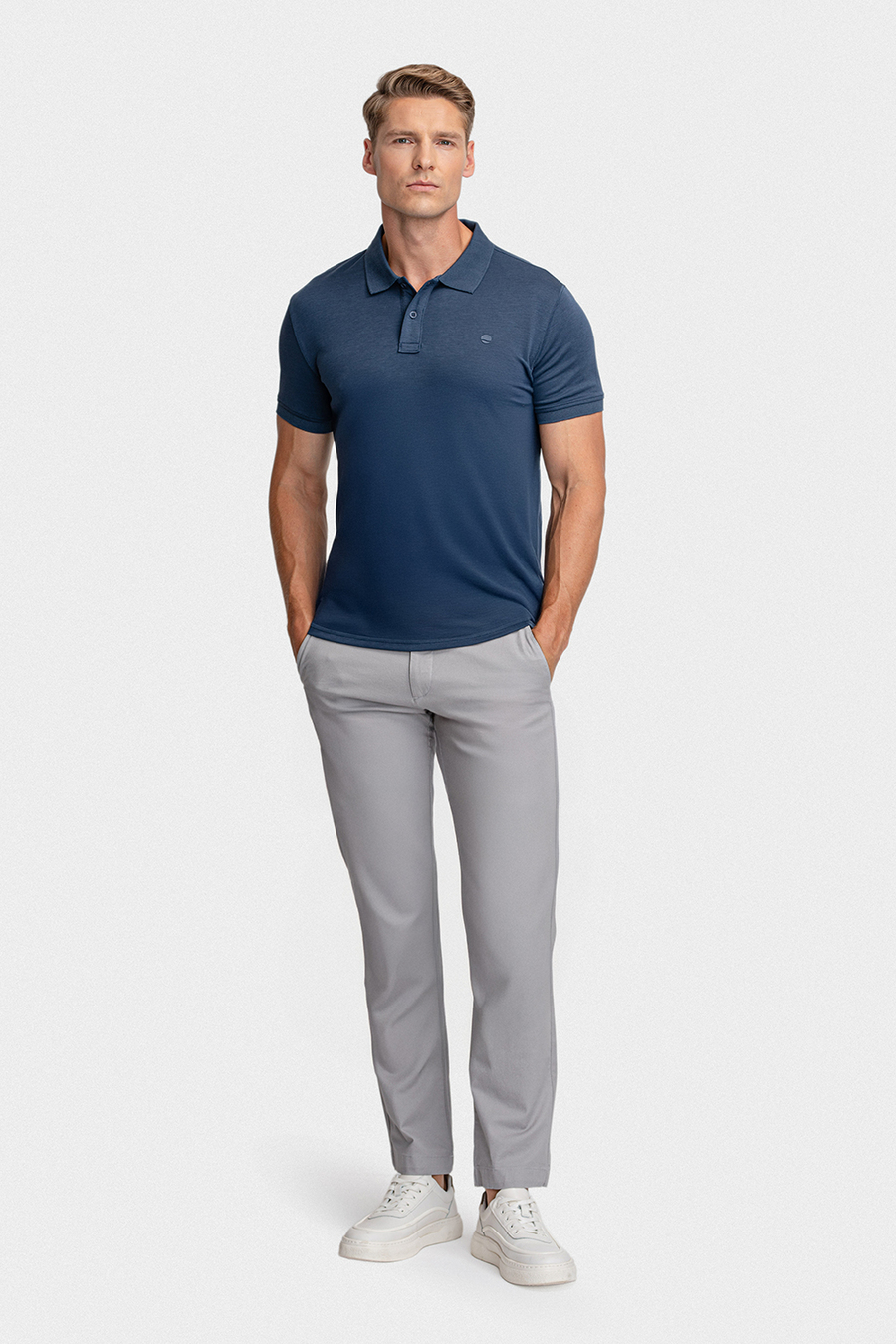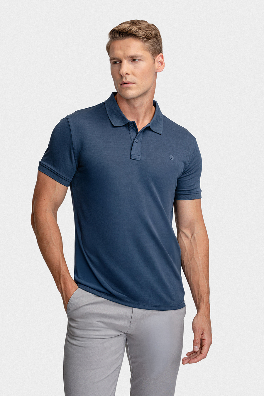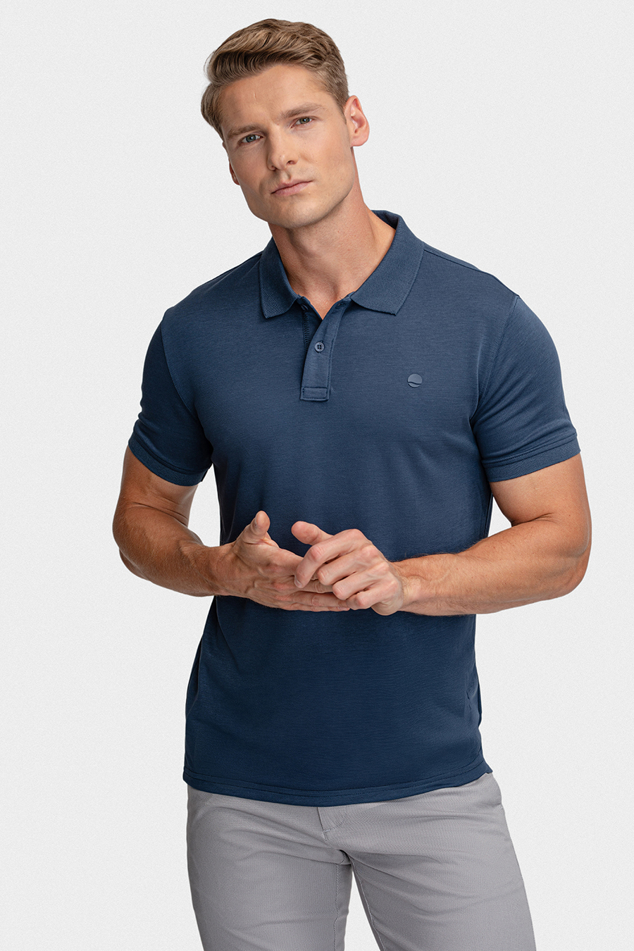 Stylowa polo w odcieniu granatowym doskonale sprawdzi się w cieplejsze dni. Gładka, lekko połyskująca faktura wprowadza subtelny akcent elegancji i świetnie komponuje się z różnorodnymi wzorami. Model posiada lekko usztywniany kołnierzyk i zapięcie na guziki, a dopasowany krój slim podkreśla atuty sylwetki.