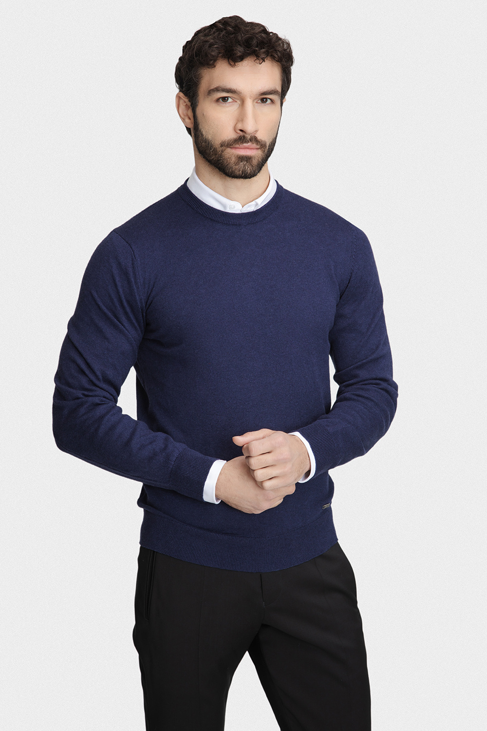 Elegancki granatowy kolor podkreśla ponadczasowy charakter swetra i czyni go wszechstronnym elementem męskiej garderoby. Okrągły dekolt typu round neck optycznie wysmukla szyję i pozwala nosić model zarówno samodzielnie, jak i w połączeniu z koszulą. Regularny fason gwarantuje swobodę ruchów i wysoki komfort użytkowania.