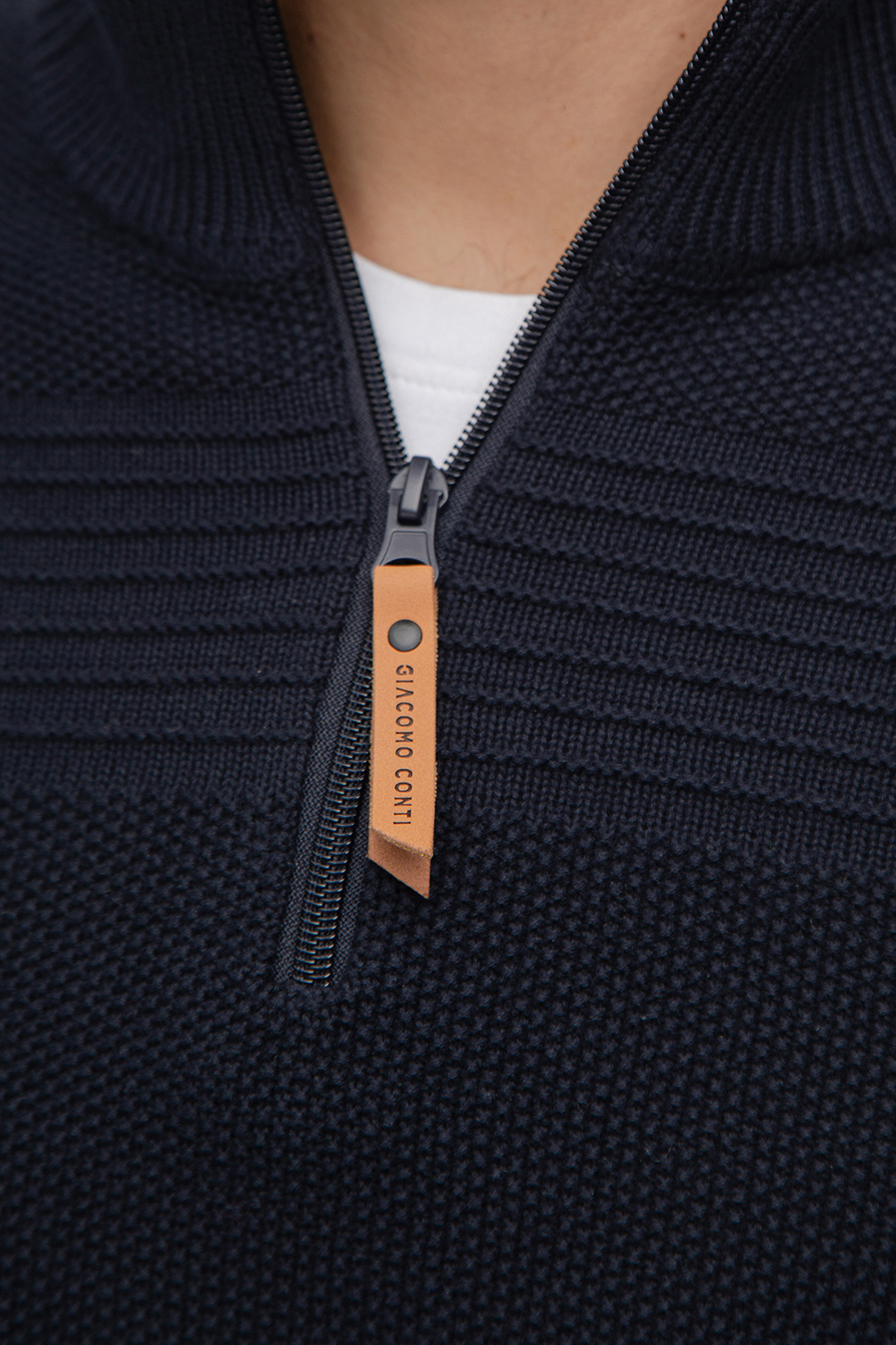 Granatowy sweter męski ze stójką to klasyka w nowoczesnym wydaniu – gruba, strukturalna dzianina przyjemnie otula i dodaje wyrafinowanej faktury. Bawełna zapewnia naturalną miękkość i oddychalność, dzięki czemu utrzymuje ciepło bez przegrzewania i pozostaje komfortowa przez cały dzień, a jednocześnie jest łatwa w pielęgnacji i trwała na wielosezonowe użytkowanie.