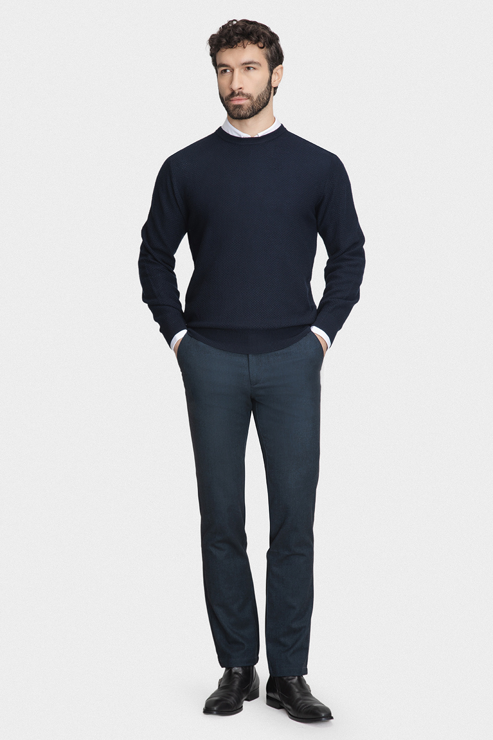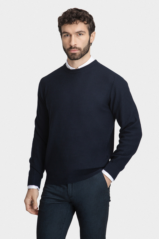 Sweter męski EDMONDO od Giacomo Conti to uosobienie prostoty w najlepszym wydaniu. W klasycznym granatowym kolorze sprawdzi się w zestawieniu z wieloma stylizacjami i stanowi absolutny must have w męskiej garderobie. Doskonale komponuje się z odcieniami granatu, czerni, szarości, brązu oraz bordo.