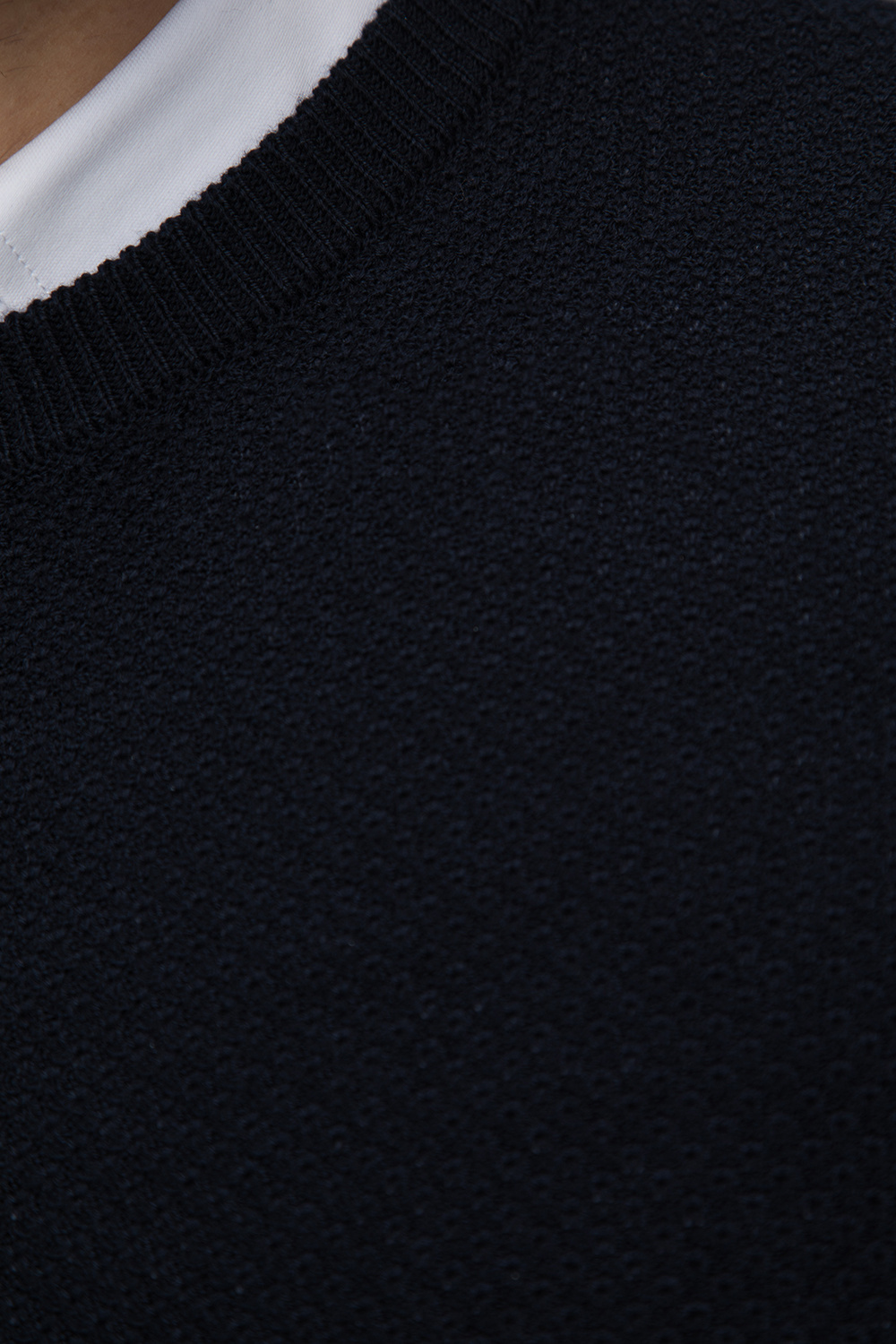 Klasyczny granatowy kolor podkreśla elegancki, uniwersalny charakter swetra. Dekolt typu round neck optycznie wydłuża szyję i dobrze prezentuje się zarówno noszony solo, jak i w połączeniu z koszulą. Fason regular zapewnia pełną swobodę ruchów i komfort przez cały dzień.