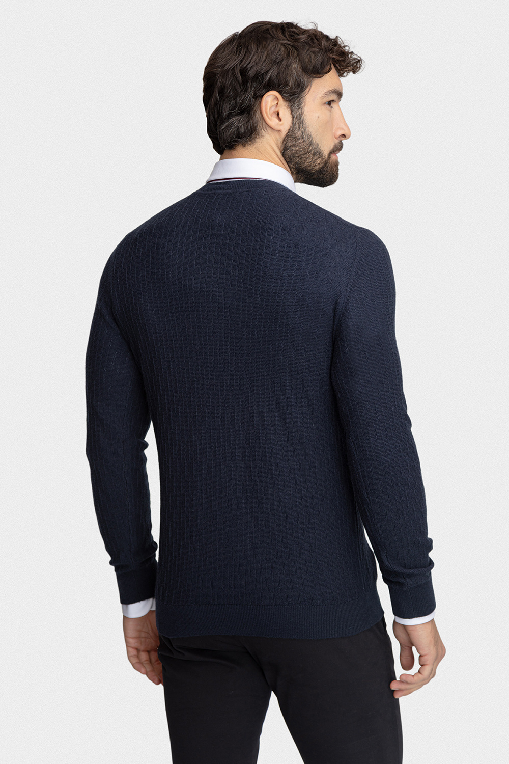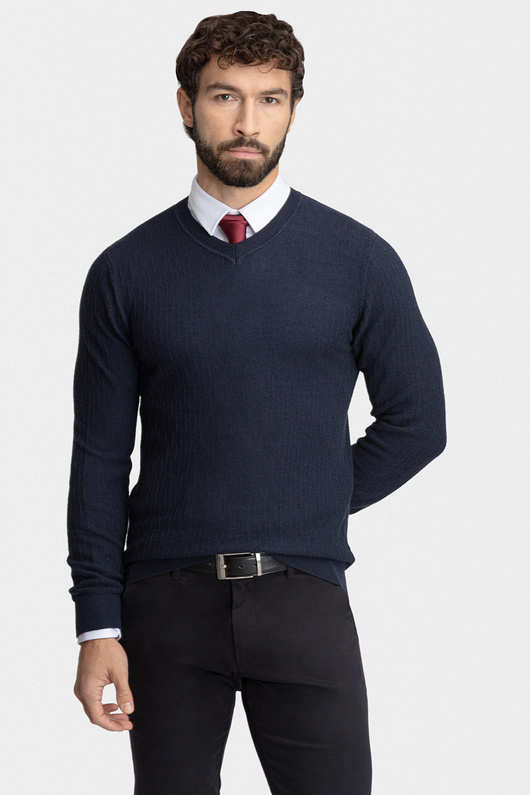Granatowy kolor nadaje stylizacji klasy i uniwersalnego charakteru – idealny zarówno do jeansów, jak i chinosów. Dekolt V-neck subtelnie wysmukla szyję i świetnie komponuje się z koszulą, tworząc elegancki, a zarazem swobodny efekt. Fason regular zapewnia swobodę ruchów i doskonałe dopasowanie do sylwetki.