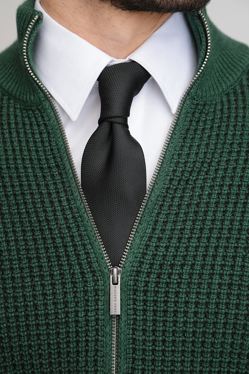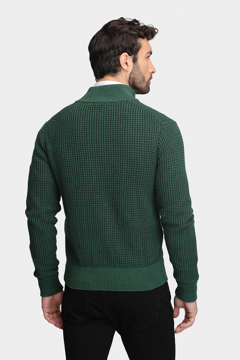 Zielony sweter męski wykonany z wysokiej jakości dzianiny o wyrazistej, strukturalnej fakturze, który łączy elegancki wygląd z codziennym komfortem noszenia. Model zapinany na praktyczny suwak, wykończony elastycznymi ściągaczami przy mankietach oraz u dołu, co zapewnia dobre dopasowanie i utrzymanie formy.