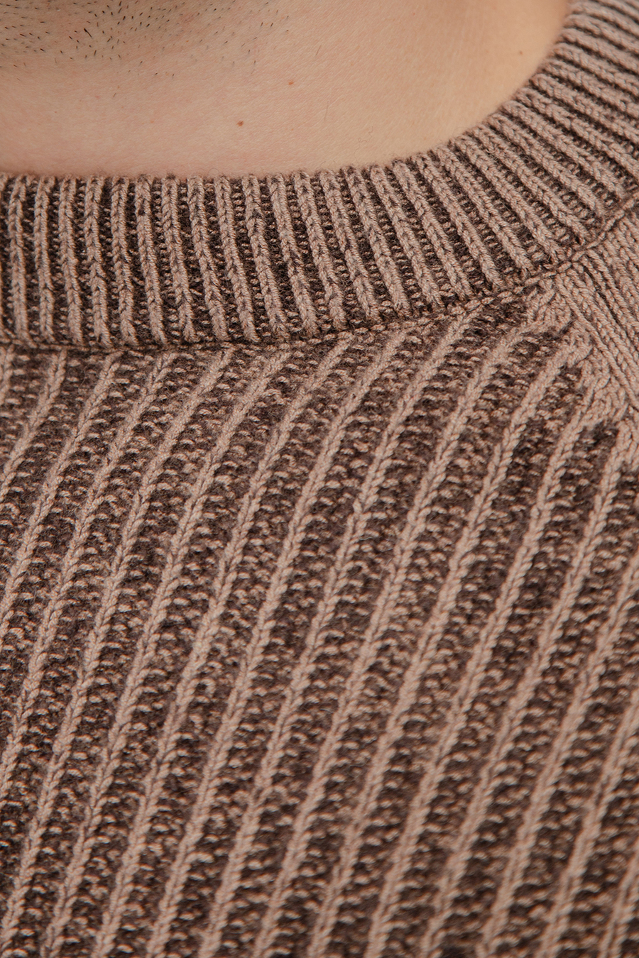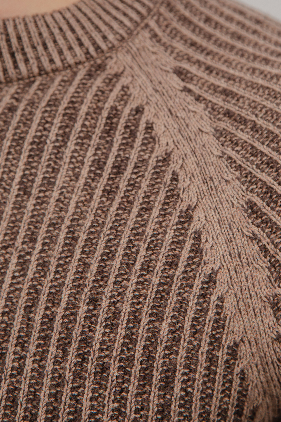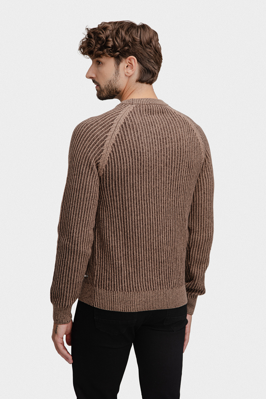 Charakterystyczna, gruba faktura w prążki nadaje mu nowoczesnego, a jednocześnie klasycznego wyglądu. Raglanowe rękawy zapewniają swobodę ruchów i podkreślają sportowo-elegancki charakter modelu, czyniąc go świetnym wyborem zarówno na co dzień, jak i na mniej formalne okazje. Uniwersalny brązowy odcień sprawia, że sweter łatwo skomponujesz z jeansami, chinosami czy eleganckimi spodniami.