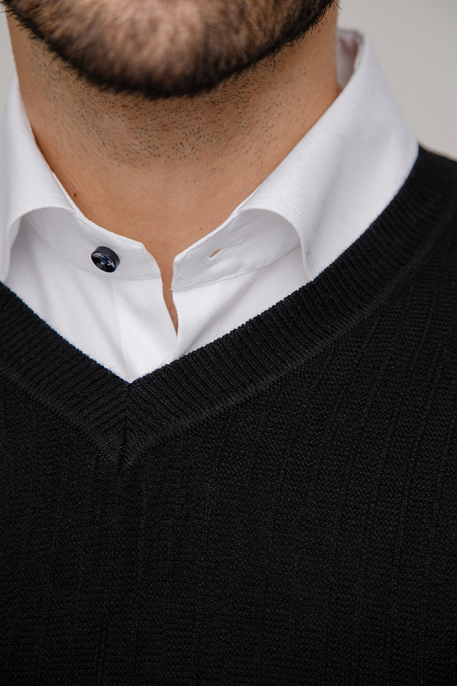 Czarny sweter męski z dekoltem w serek (v-neck) z linii FABRIZIO to ponadczasowa, basicowa propozycja od Giacomo Conti, która powinna znaleźć się w garderobie każdego mężczyzny. Idealnie sprawdzi się w zestawieniu z koszulą, jeansami czy smart-casualową marynarką, tworząc elegancki, a zarazem wygodny look.