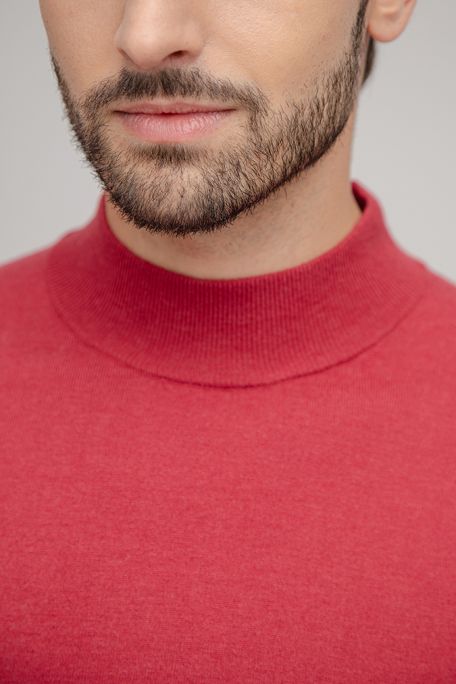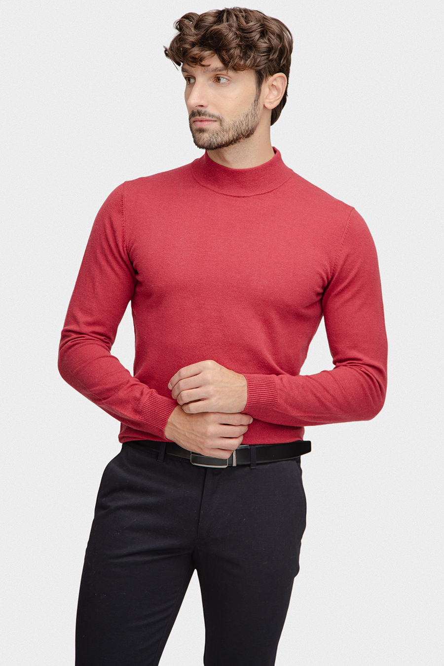 Gładka faktura i intensywny czerwony kolor nadają swetrowi elegancki, a zarazem nowoczesny charakter. Golfowy kołnierz subtelnie podkreśla szyję, a ściągacze przy rękawach i u dołu gwarantują idealne dopasowanie i utrzymanie ciepła. Regularny krój zapewnia pełną swobodę ruchów oraz wygodę w codziennym użytkowaniu.