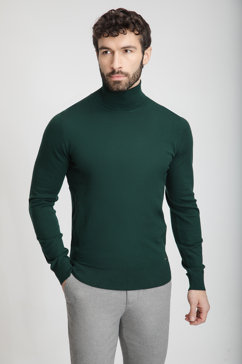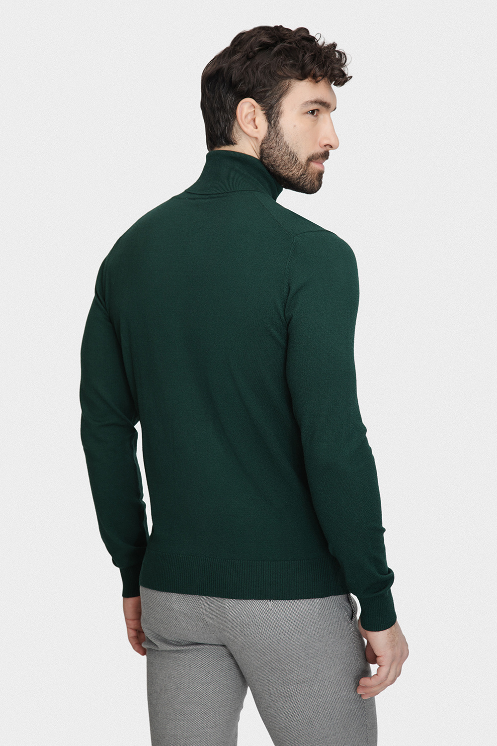 Głęboki zielony kolor ożywia stylizację i dodaje jej charakteru, doskonale komponując się z odcieniami brązu, czerni, beżu czy bordo. Wysoki golf skutecznie chroni szyję przed chłodem, a ponadczasowy design sprawia, że sweter RUFO to uniwersalny element męskiej garderoby.