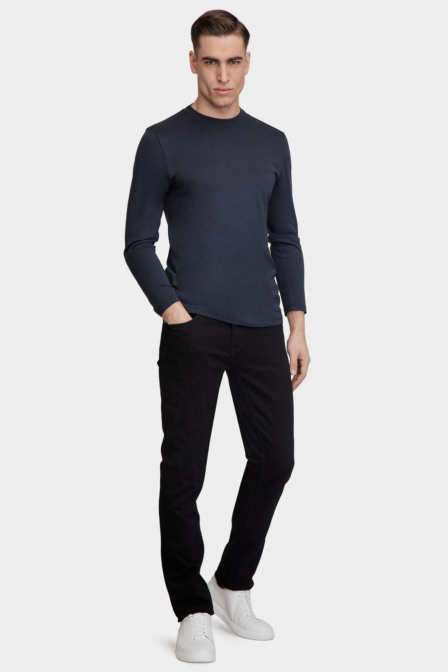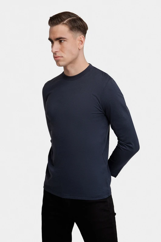 Klasyczny granatowy longsleeve wykonany z wysokiej jakości mieszanki bawełny, modalu i jedwabiu. Materiał jest miękki, przyjemny w dotyku i oddychający, a dzięki dodatkowi jedwabiu zyskuje wyjątkową gładkość. Elastan zapewnia elastyczność i lepsze dopasowanie do sylwetki.